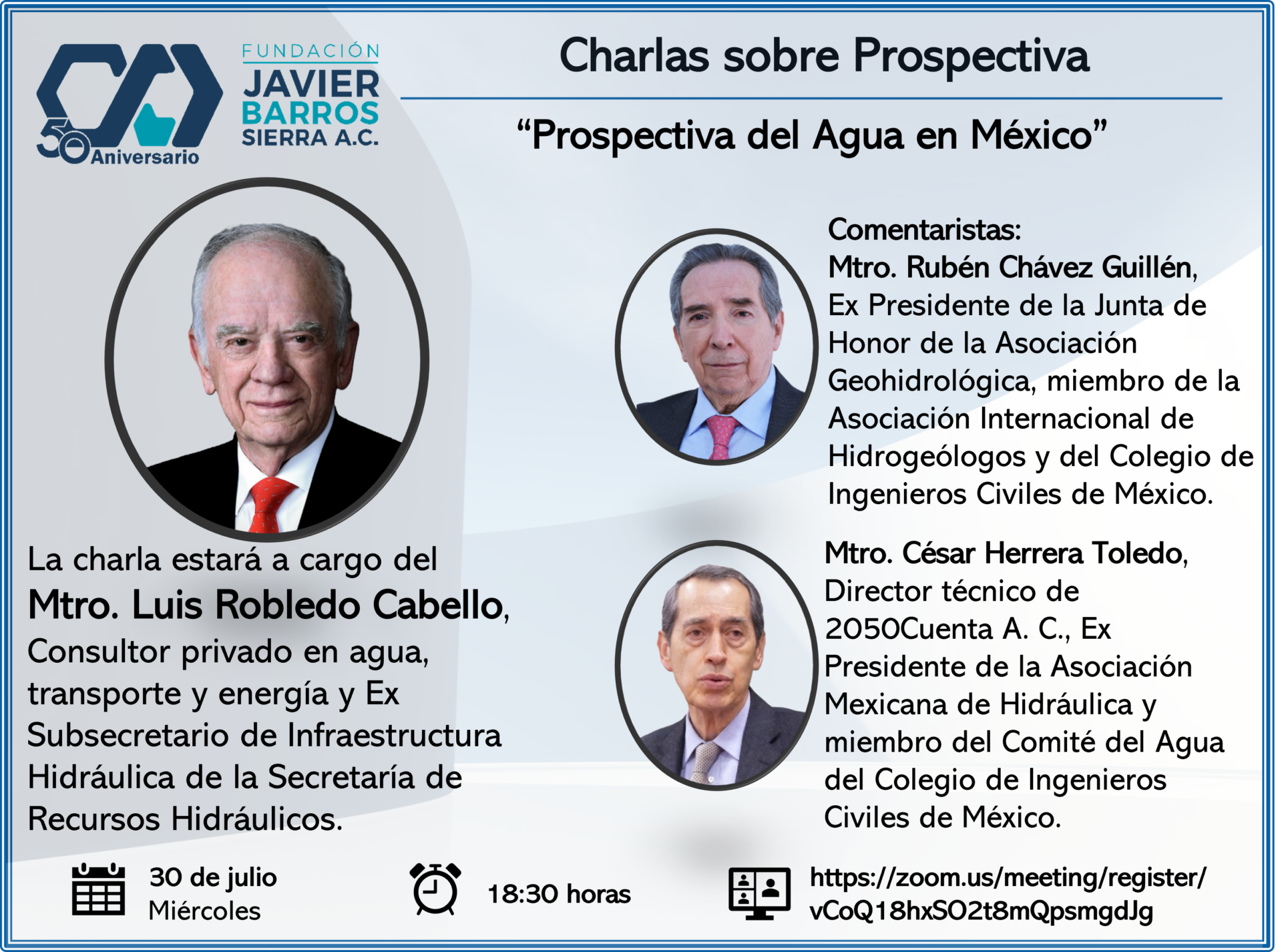 La charla estará a cargo del Mtro. Luis Robledo Cabello, Consultor privado en agua, transporte y energía y Ex Subsecretario de Infraestructura Hidráulica de la Secretaría de Recursos Hidráulicos; contará con los comentarios del Mtro. Rubén Chávez Guillén, Ex Presidente de la Junta de Honor de la Asociación Geohidrológica, miembro de la Asociación Internacional de Hidrogeólogos y del Colegio de Ingenieros Civiles de México; así como del Mtro. César Herrera Toledo, Director técnico de 2050Cuenta A. C., Ex Presidente de la Asociación Mexicana de Hidráulica y miembro del Comité del Agua del Colegio de Ingenieros Civiles de México.